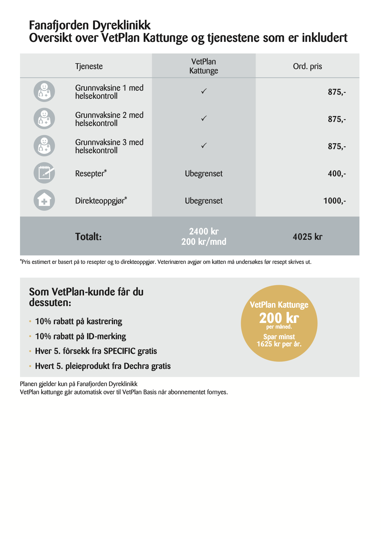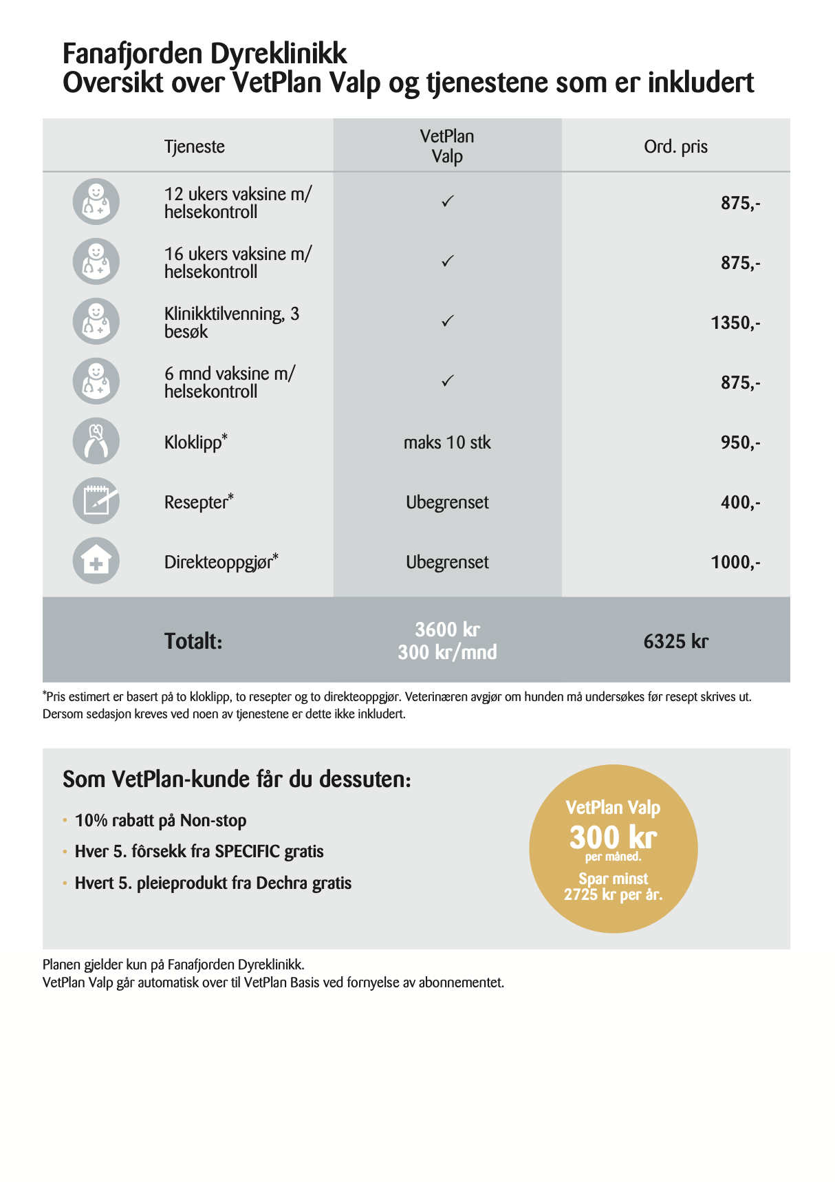Dersom du lurer på pris på noe som ikke står oppført må du gjerne ringe oss på 455 00 630 eller sende en e-post til post@fanavet.no så skal vi gjøre vårt beste for å hjelpe deg.