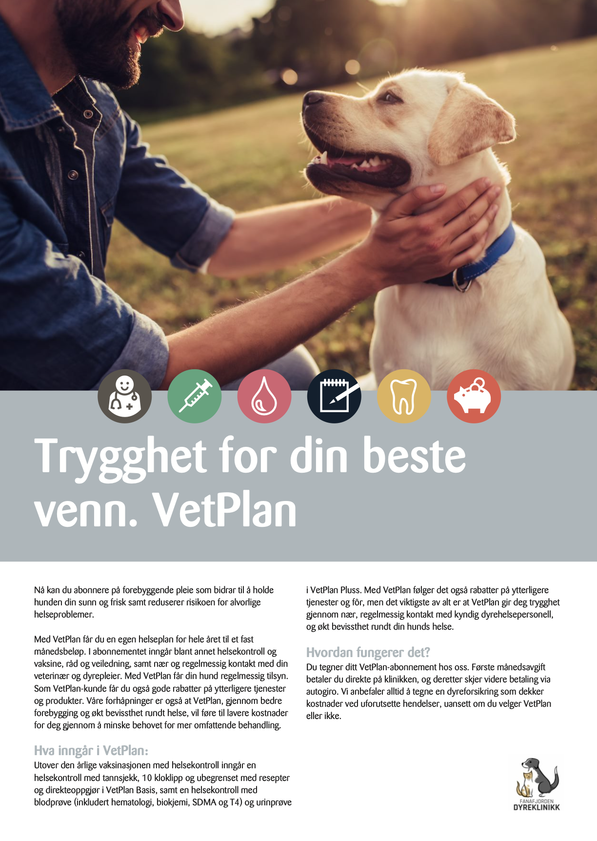 – Seniorkontroll hund: helsekontroll, blodprøver, urinprøve (urin må tas med til klinikken) – 3400kr